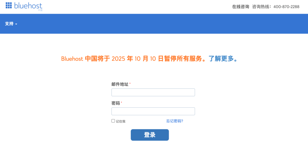 自 2025 年 10 月 10 日起,Bluehost 中国将暂停在该地区的服务。由于业务转型,我们作出了这一重大决定。我们将终止您的所有非域名订单,并为您尚未使用的订阅期按比例退款。